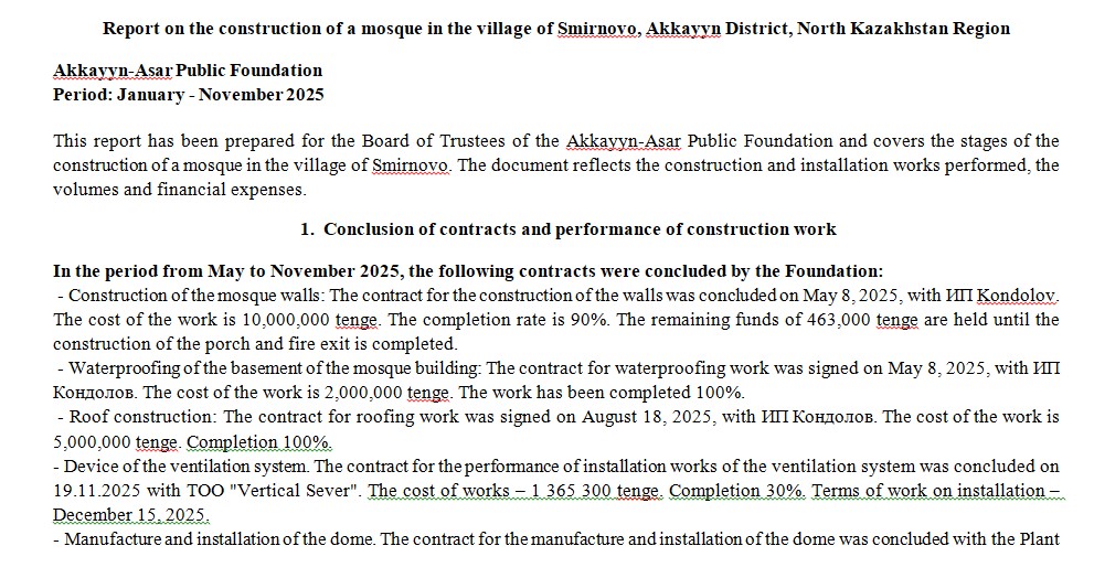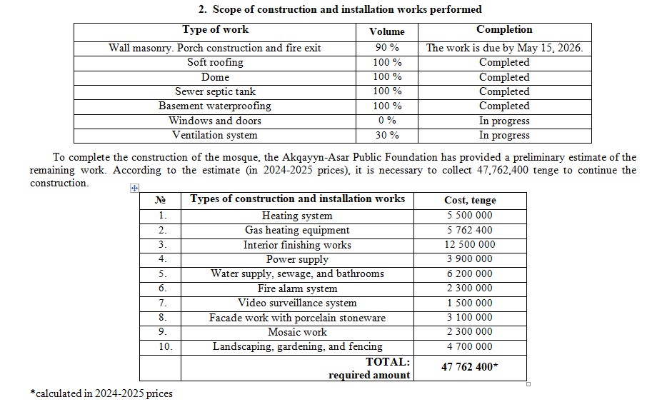 Report on the construction of a mosque in the village of Smirnovo, Akkayyn District, North Kazakhstan Region. Scope of work
