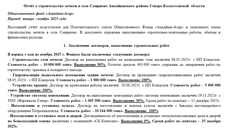 Отчёт о строительстве мечети в селе Смирново Аккайынского района Северо-Казахстанской области