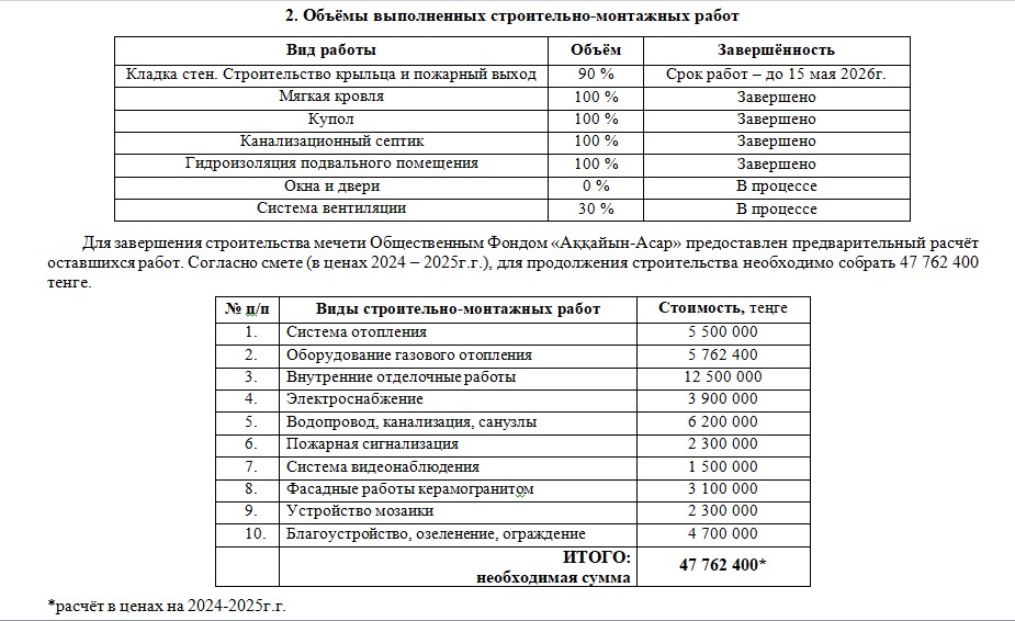 Отчёт о строительстве мечети в селе Смирново Аккайынского района Северо-Казахстанской области. Oбъёмы работ