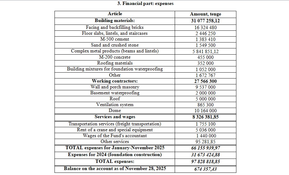 Report on the construction of a mosque in the village of Smirnovo, Akkayyn District, North Kazakhstan Region. Expenses